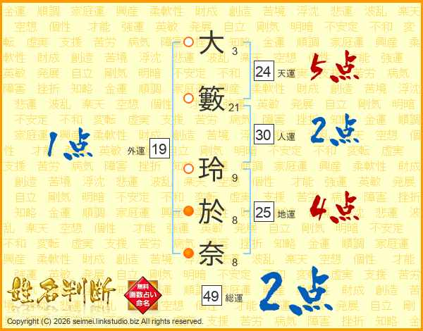 大(3画)籔(21画) 玲(9画)於(8画)奈(8画)
