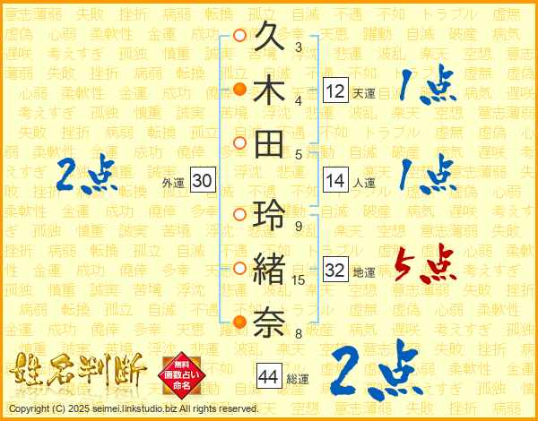 久(3画)木(4画)田(5画) 玲(9画)緒(15画)奈(8画)