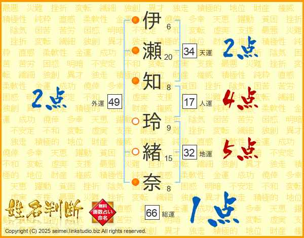 伊瀬知玲緒奈さんの総運は66画の1点!