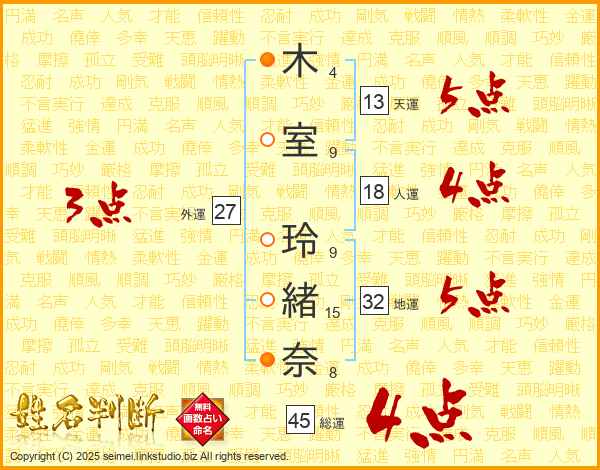 木(4画)室(9画)  玲(9画)緒(15画)奈(8画)
