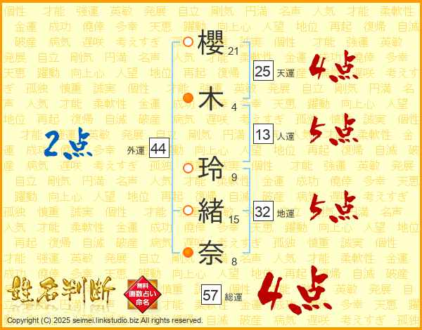 櫻(21画)木(4画) 玲(9画)緒(15画)奈(8画)