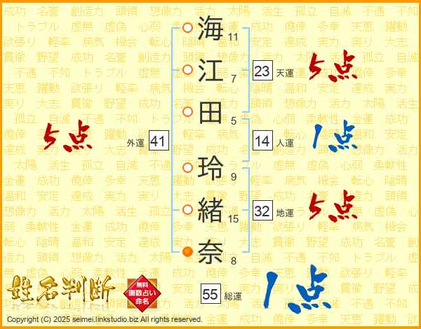 海(11画)江(7画)田(5画) 玲(9画)緒(15画)奈(8画)