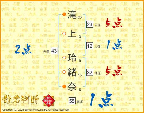 滝上玲緒奈さんの外運は43画の2点!