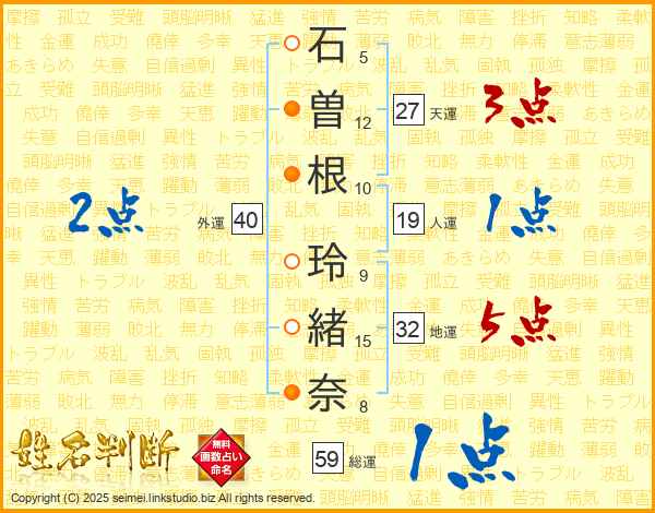 石(5画)曽(12画)根(10画) 玲(9画)緒(15画)奈(8画)
