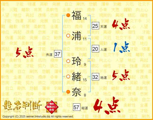 福(14画)浦(11画) 玲(9画)緒(15画)奈(8画)