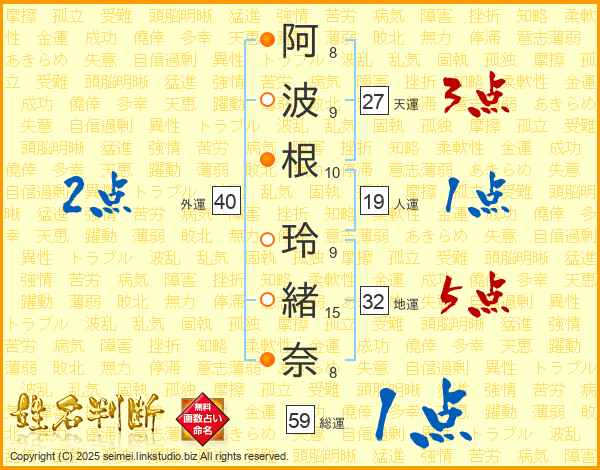 阿(8画)波(9画)根(10画) 玲(9画)緒(15画)奈(8画)