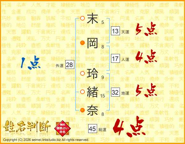 末(5画)岡(8画) 玲(9画)緒(15画)奈(8画)