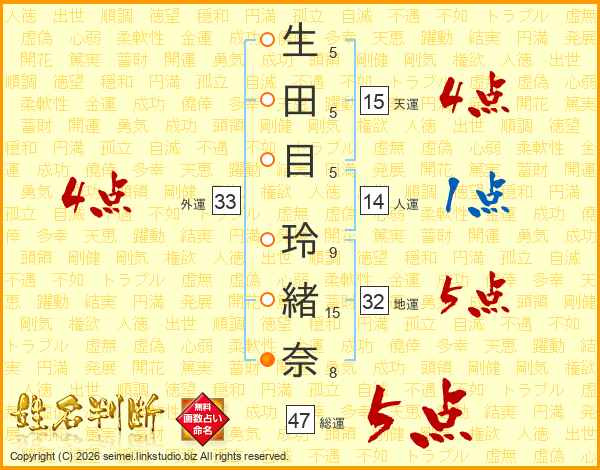 生田目玲緒奈さんの外運は33画の4点!