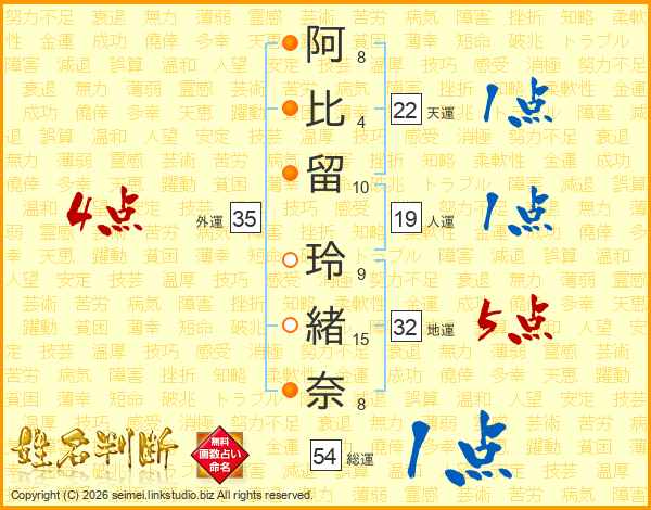 阿(8画)比(4画)留(10画) 玲(9画)緒(15画)奈(8画)