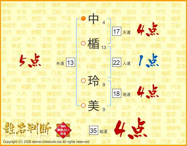 中楯玲美さんの天運は17画の4点!