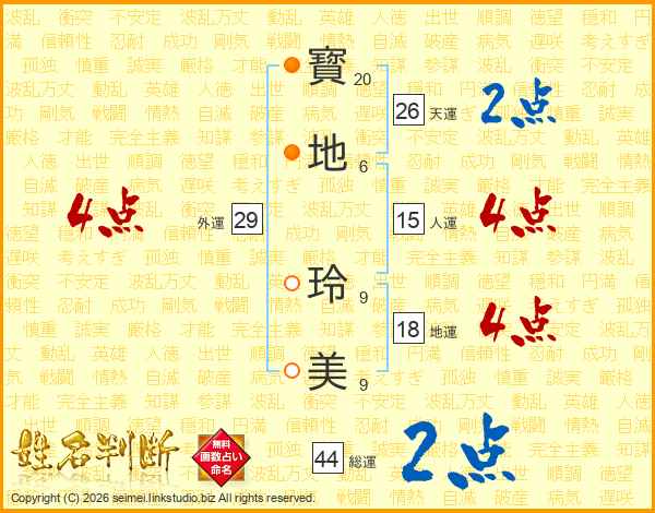 寳(20画)地(6画) 玲(9画)美(9画)
