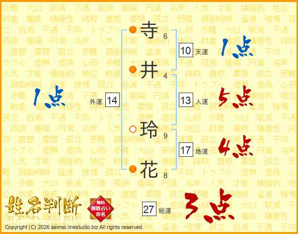 生活面を象徴する運勢です。外部から受ける影響力を表し、結婚運、家庭運や職場、環境への順応性を表します。総運から人運を引いた画数。姓や名が1文字の場合を除く。