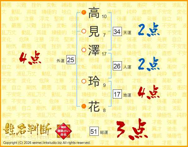 高(10画)見(7画)澤(17画) 玲(9画)花(8画)