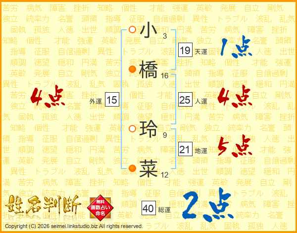 小(3画)橋(16画) 玲(9画)菜(12画)