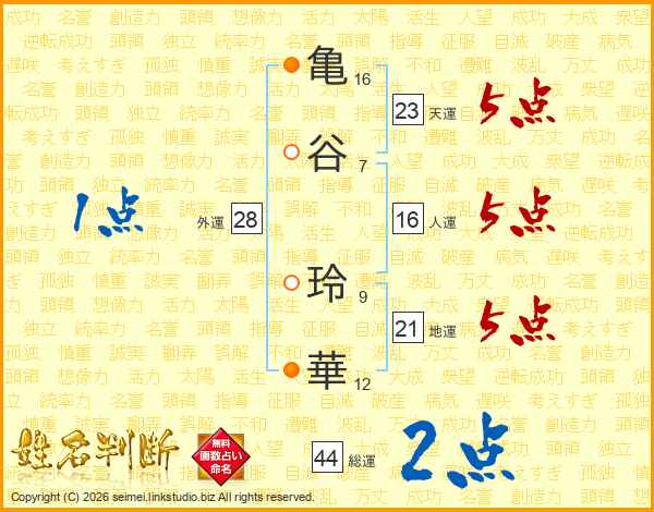 亀(16画)谷(7画) 玲(9画)華(12画)