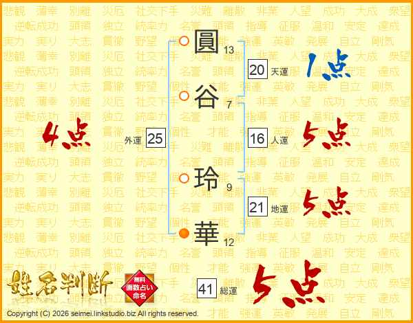 圓(13画)谷(7画) 玲(9画)華(12画)