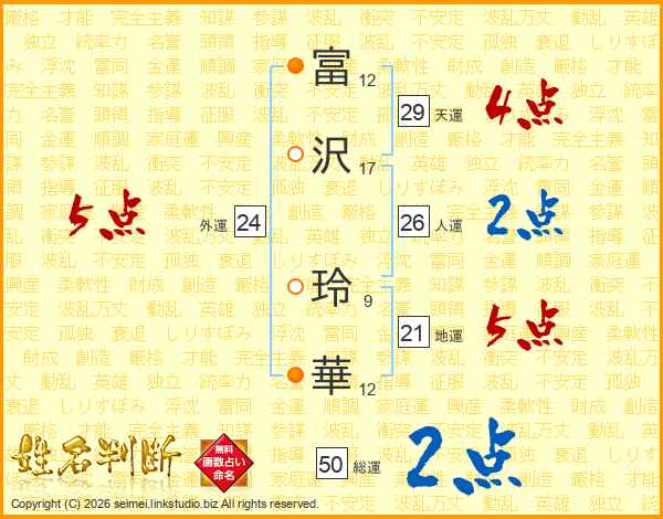 富(12画)沢(17画) 玲(9画)華(12画)