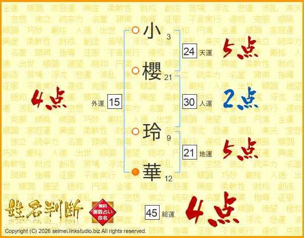 小(3画)櫻(21画) 玲(9画)華(12画)