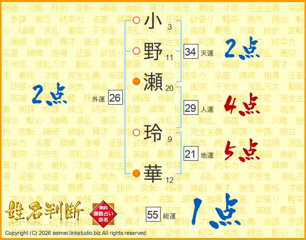 小(3画)野(11画)瀬(20画) 玲(9画)華(12画)