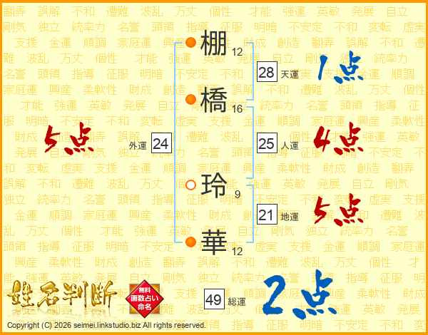 棚(12画)橋(16画) 玲(9画)華(12画)