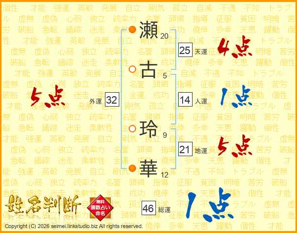 瀬(20画)古(5画) 玲(9画)華(12画)