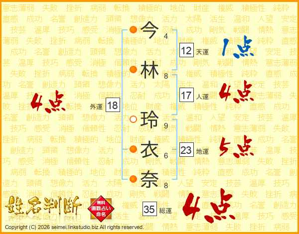 今(4画)林(8画) 玲(9画)衣(6画)奈(8画)