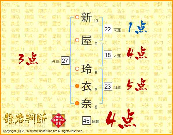 新屋玲衣奈さんの総運は45画の4点!