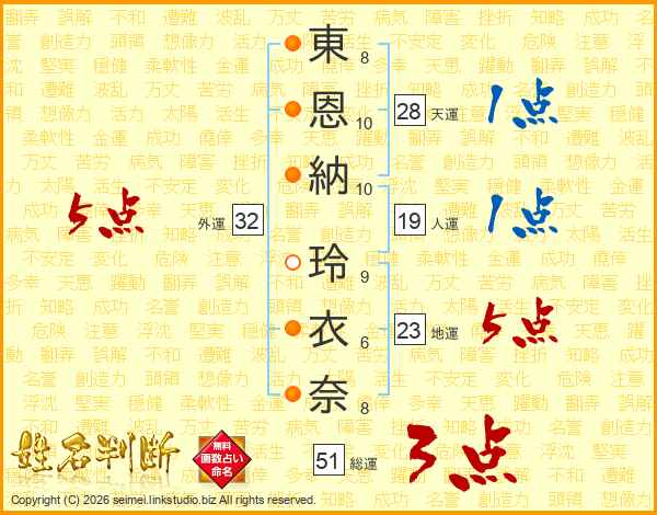 東(8画)恩(10画)納(10画) 玲(9画)衣(6画)奈(8画)