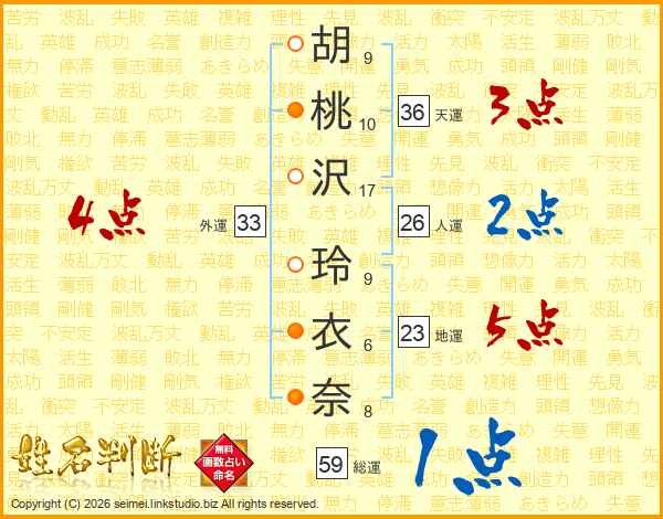 胡(9画)桃(10画)沢(17画) 玲(9画)衣(6画)奈(8画)