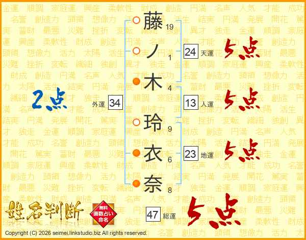 藤(19画)ノ(1画)木(4画) 玲(9画)衣(6画)奈(8画)