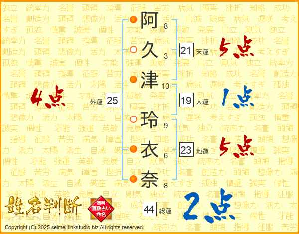 阿(8画)久(3画)津(10画) 玲(9画)衣(6画)奈(8画)