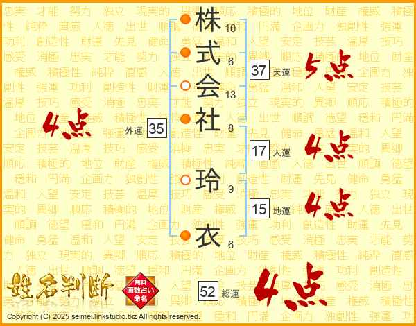 株(10画)式(6画)会(13画)社(8画) 玲(9画)衣(6画)
