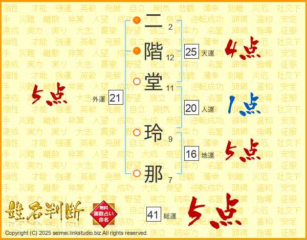 二(2画)階(12画)堂(11画) 玲(9画)那(7画)