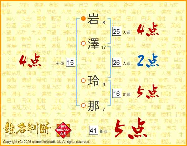 岩(8画)澤(17画) 玲(9画)那(7画)