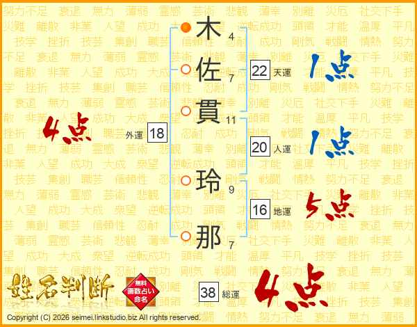 木(4画)佐(7画)貫(11画) 玲(9画)那(7画)