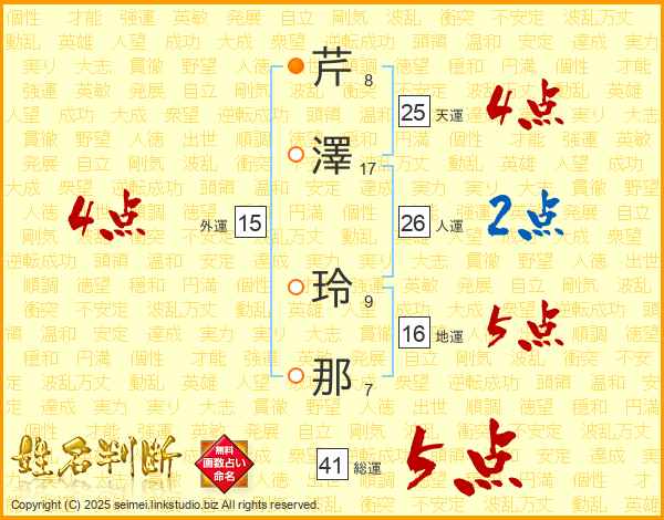 芹(8画)澤(17画) 玲(9画)那(7画)