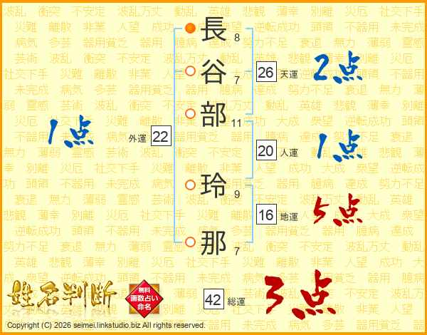 長(8画)谷(7画)部(11画) 玲(9画)那(7画)
