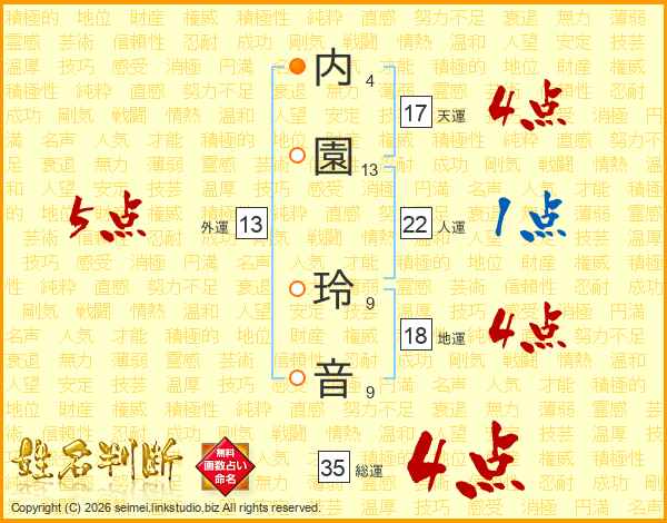 内(4画)園(13画) 玲(9画)音(9画)
