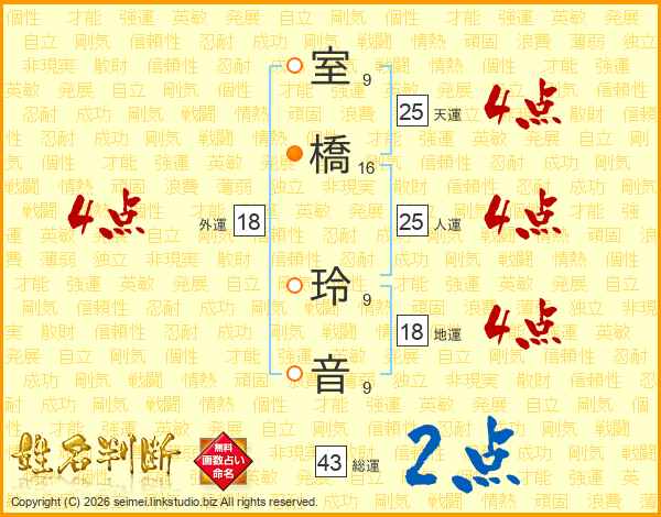 室(9画)橋(16画) 玲(9画)音(9画)