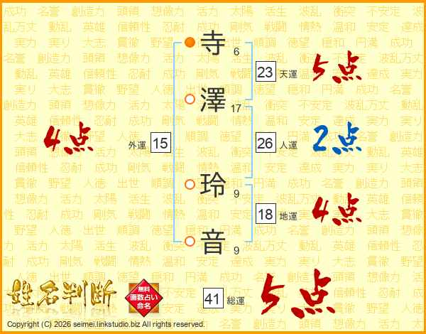 寺(6画)澤(17画) 玲(9画)音(9画)