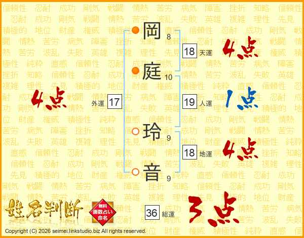 岡(8画)庭(10画) 玲(9画)音(9画)