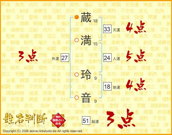 蔵(18画)満(15画) 玲(9画)音(9画)