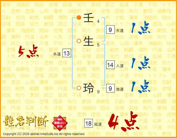壬(4画)生(5画) 玲(9画)