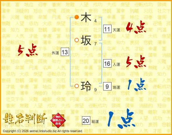 木(4画)坂(7画) 玲(9画)