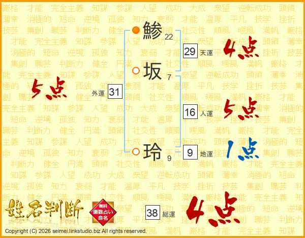 鯵坂玲さんの総運は38画の4点!