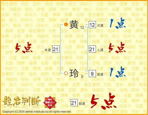 生活面を象徴する運勢です。外部から受ける影響力を表し、結婚運、家庭運や職場、環境への順応性を表します。総運から人運を引いた画数。姓や名が1文字の場合を除く。