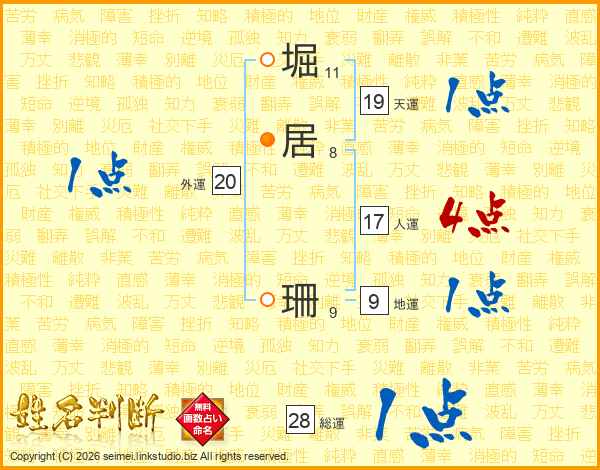 生活面を象徴する運勢です。外部から受ける影響力を表し、結婚運、家庭運や職場、環境への順応性を表します。総運から人運を引いた画数。姓や名が1文字の場合を除く。
