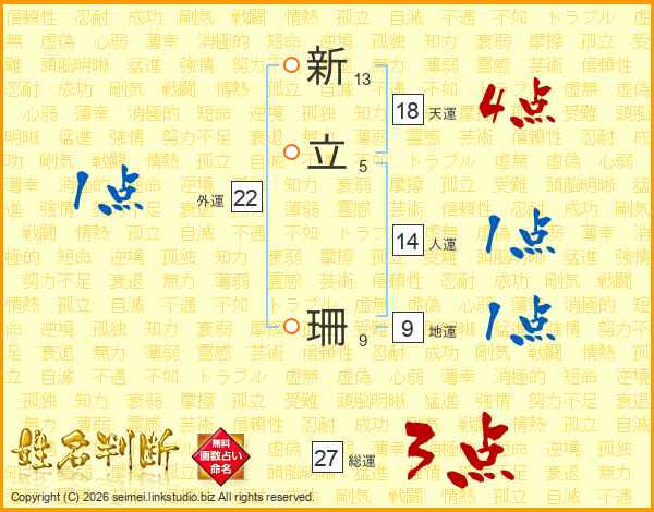 生活面を象徴する運勢です。外部から受ける影響力を表し、結婚運、家庭運や職場、環境への順応性を表します。総運から人運を引いた画数。姓や名が1文字の場合を除く。