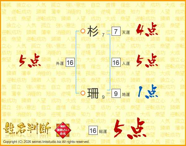 あなたの人生を表す1番重要な運勢です。生涯を通じて影響する総合運となり、主に50歳以降の晩年期に影響を及ぼします。苗字と名前の合計画数。