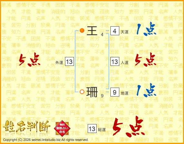 生活面を象徴する運勢です。外部から受ける影響力を表し、結婚運、家庭運や職場、環境への順応性を表します。総運から人運を引いた画数。姓や名が1文字の場合を除く。